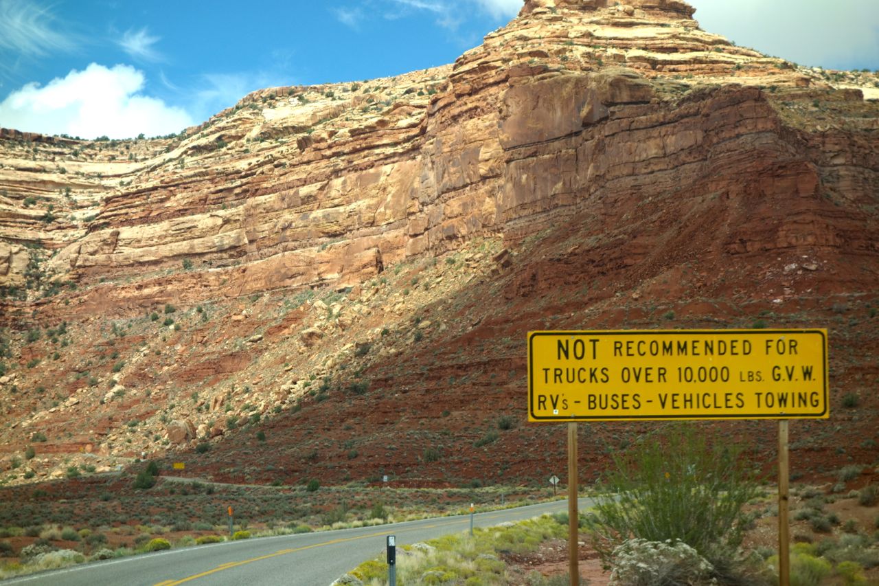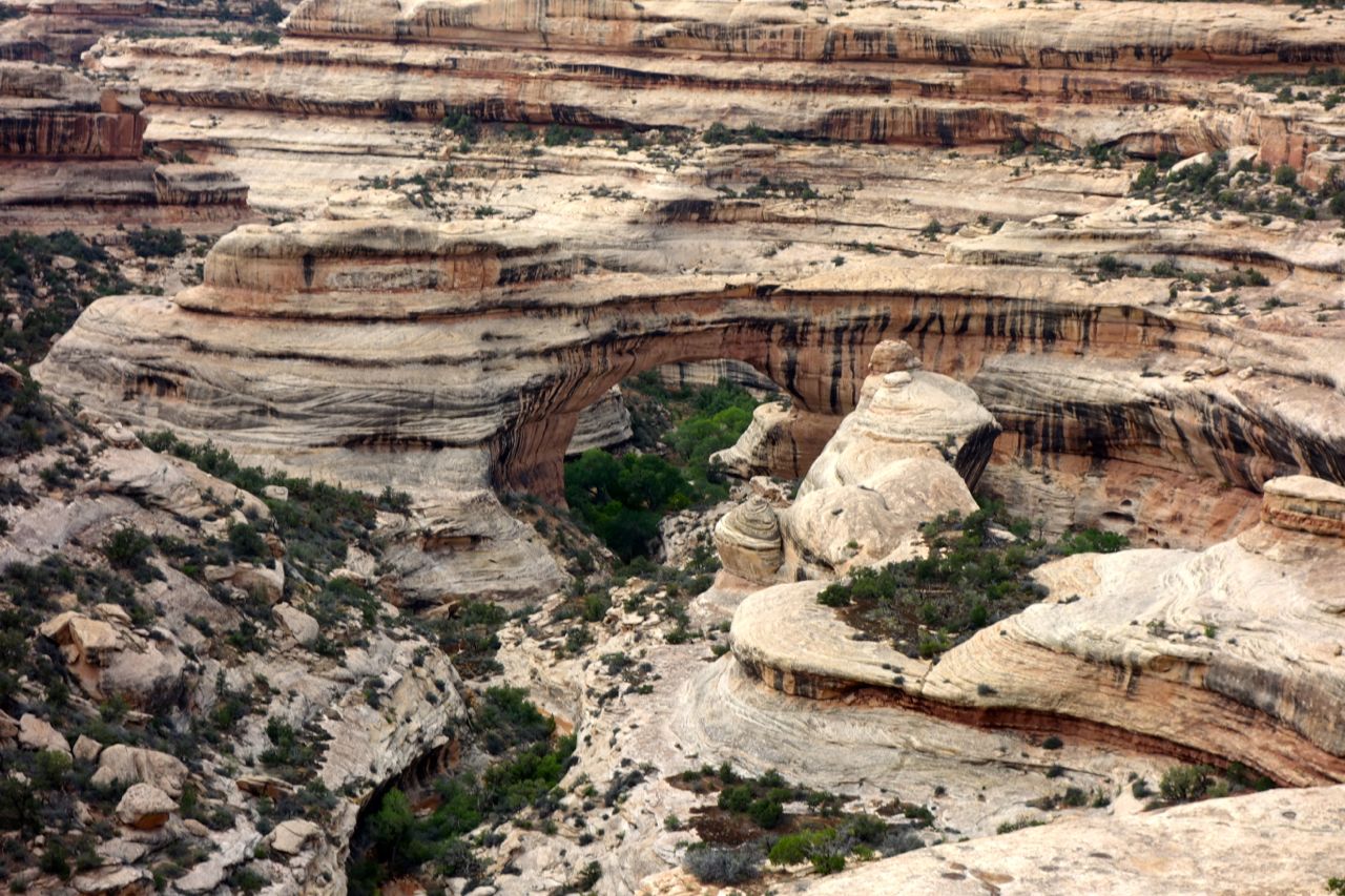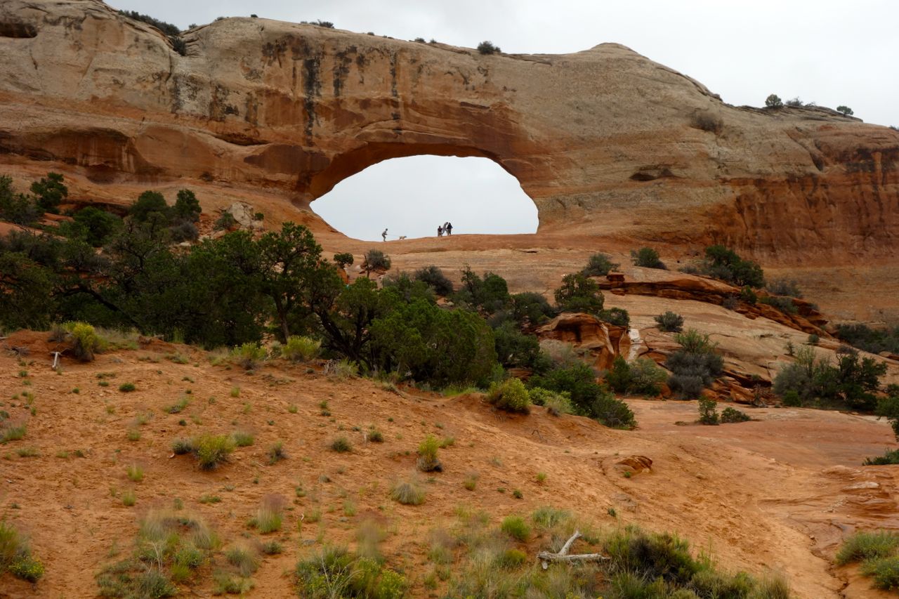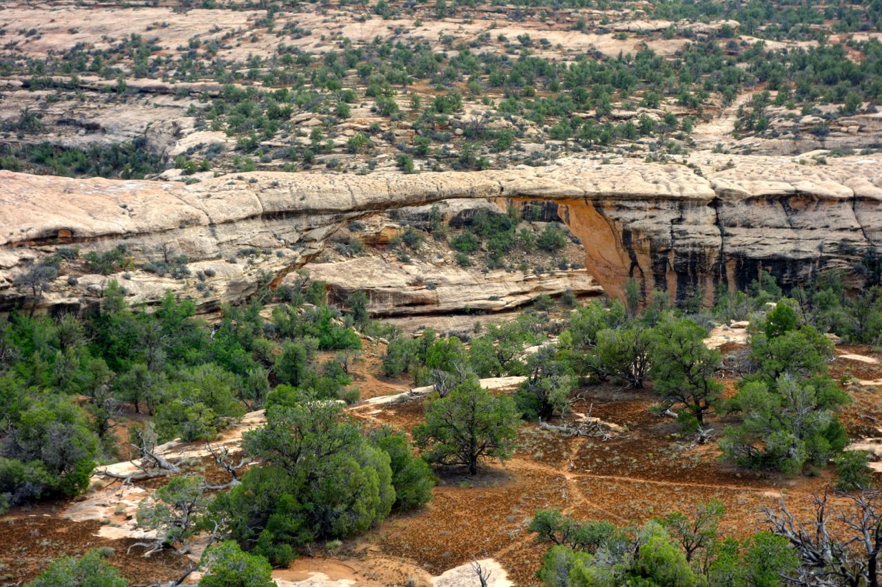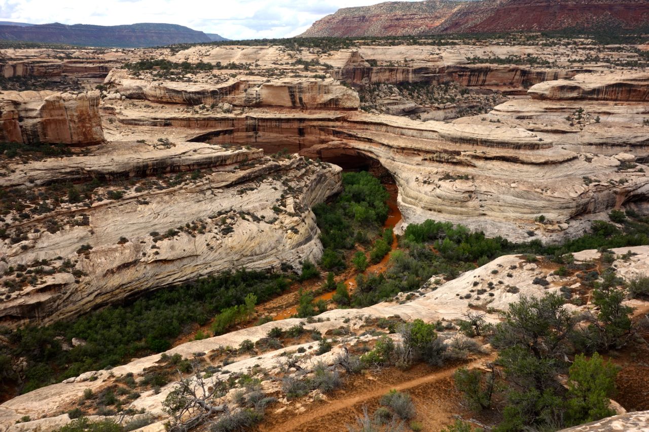 Weil das Wetter nicht optimal ist, halten wir uns nicht sehr lange im Monument Valley auf und fahren weiter Richtung Norden zum Goosenecks State Park, wo der San Juan River mehrere Schlaufen zieht. Anschliessend fahren für zum Natural Bridges Park, wo man drei durch einen Fluss natürlich ausgewaschene Brücken sieht. Weiter geht es Richtung Moab, wo wir im Canyonlands Campground übernachten.