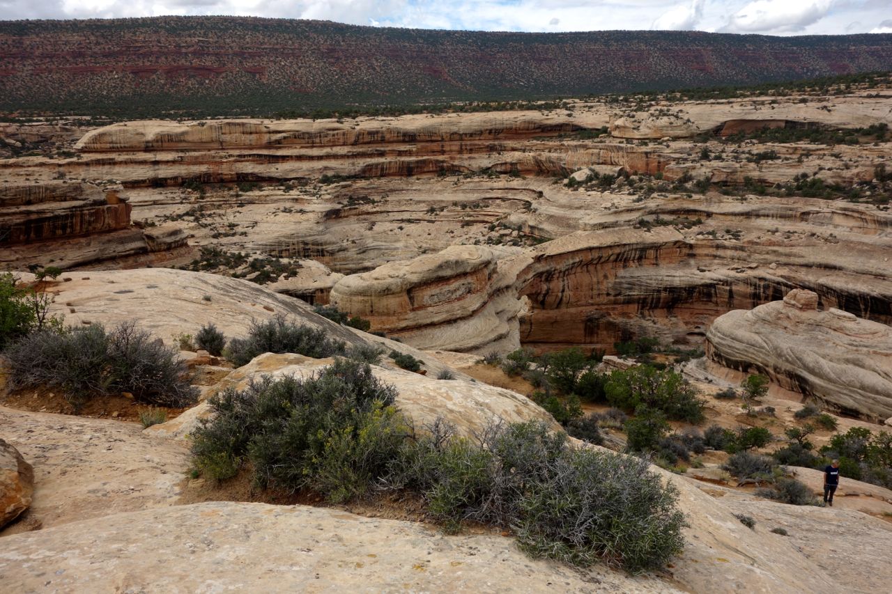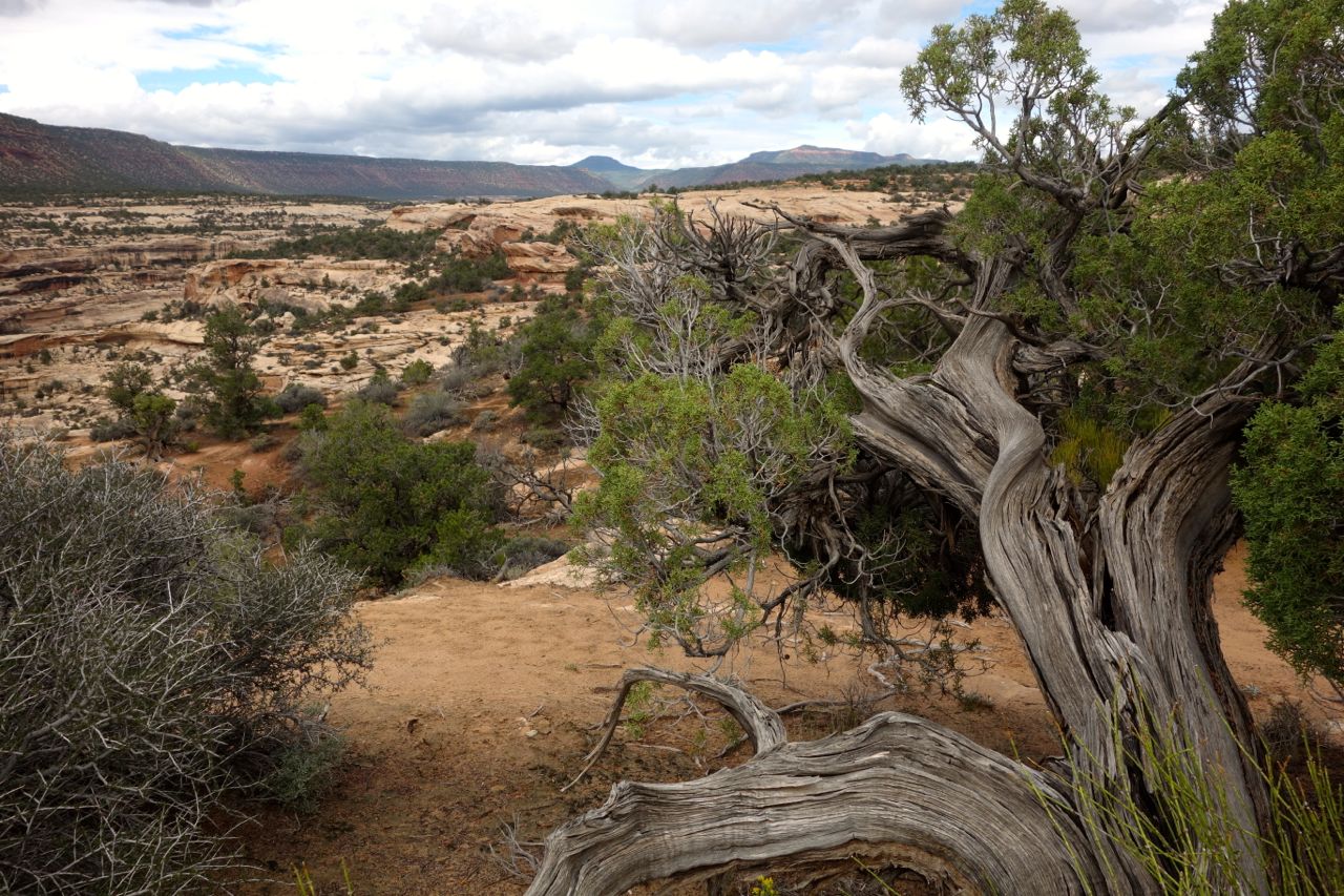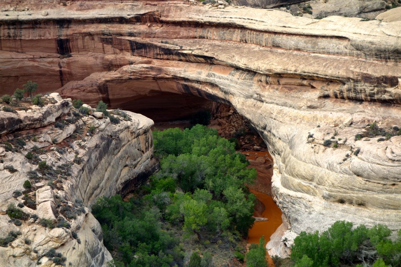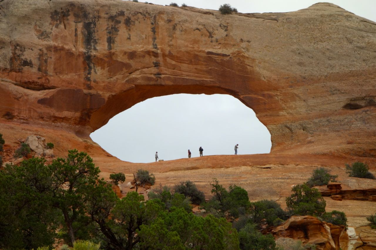 Weil das Wetter nicht optimal ist, halten wir uns nicht sehr lange im Monument Valley auf und fahren weiter Richtung Norden zum Goosenecks State Park, wo der San Juan River mehrere Schlaufen zieht. Anschliessend fahren für zum Natural Bridges Park, wo man drei durch einen Fluss natürlich ausgewaschene Brücken sieht. Weiter geht es Richtung Moab, wo wir im Canyonlands Campground übernachten.